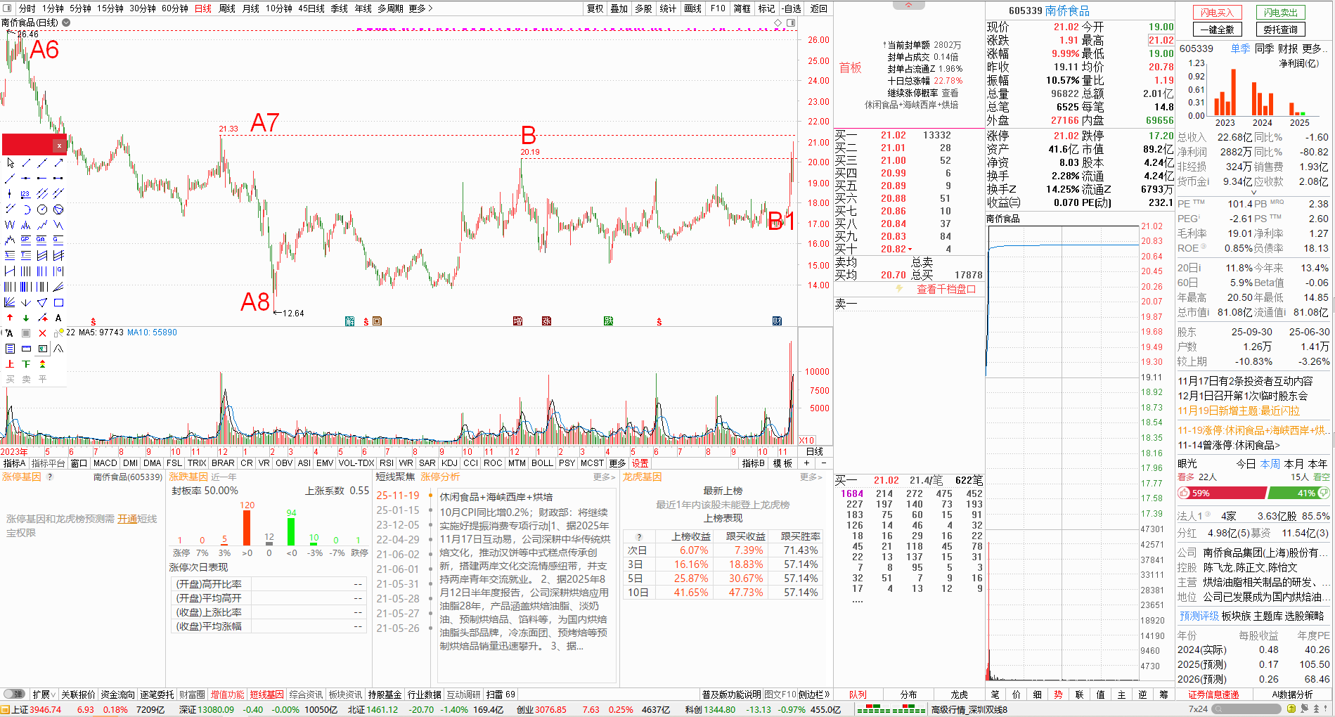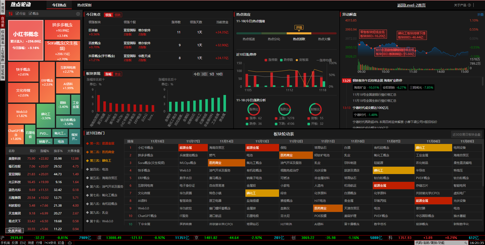 今天大盘延续昨天的跌势,出现了剧烈的震荡,到收盘时候止,上证跌了0.81%,深证跌了0.92%,北证跌了2.92%,创业板跌了1.16%,科创板微涨0.29%。沪深北三市5451只个股,下跌4106只,跌停36只,上涨的个股只剩下1277只,涨停62只。