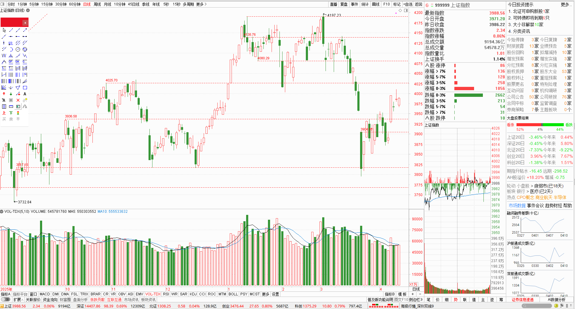 受美伊停战两周的消息影响,今天A股逆势大涨,到收盘时止,上证大涨2.70%,深证大涨4.79%,北证大涨4.56%,创业板大涨5.91%,科创板大涨6.18%。沪深北三市5498只个股,上涨5174只,涨停135只,下跌仅剩301只,跌停12只。