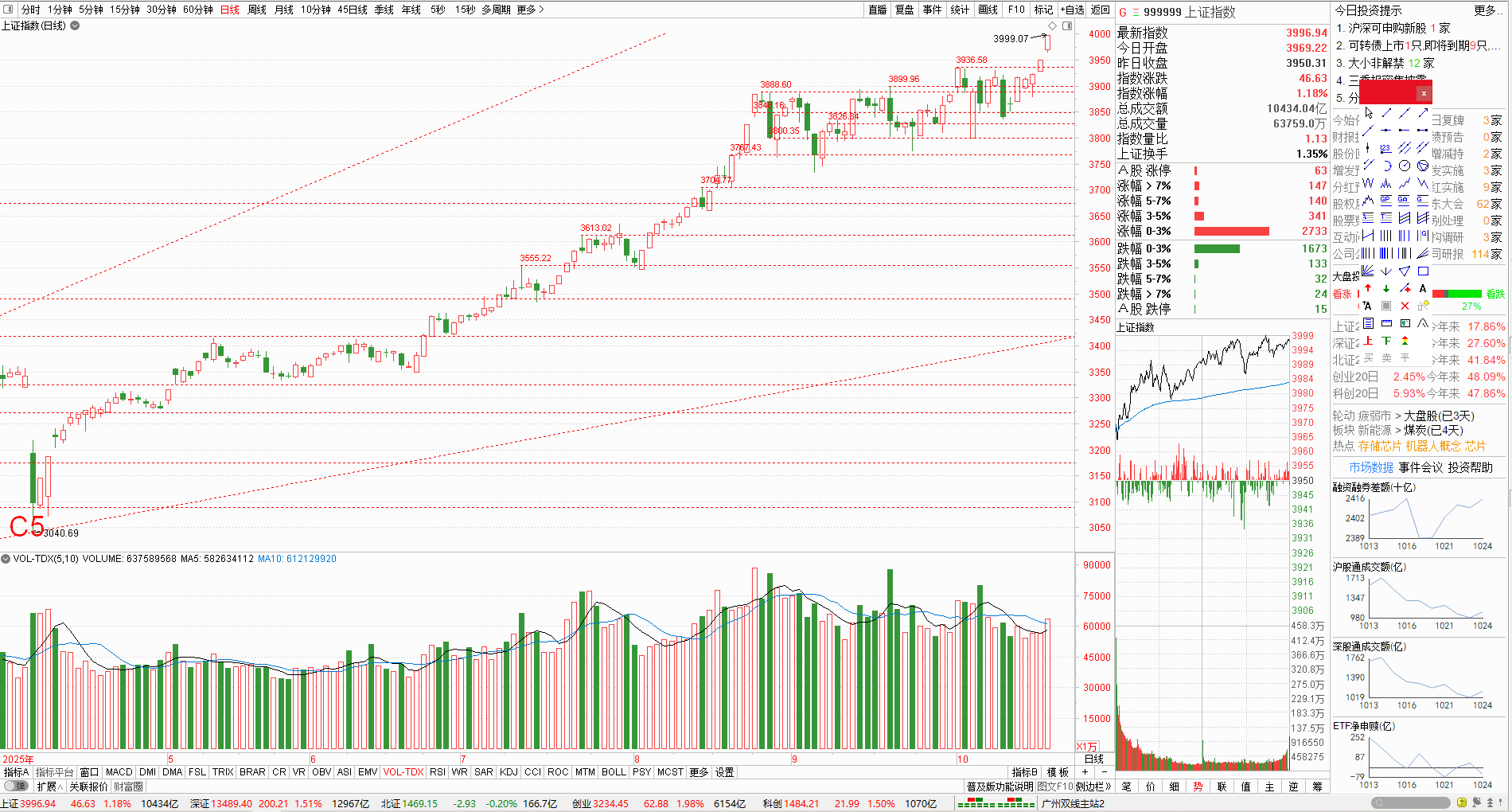 今天股市沿着惯性继续向上,到收盘时止,除北证微跌0.20%外,其他几个指数都出现大涨,其中上证涨了1.18%,深证涨了1.51%,创业板涨了1.98%,科创板涨了1.50%。沪深北三市5440只个股,上涨3361只,涨停63只,下跌1862只,跌停15只。赚钱效应依然强势。