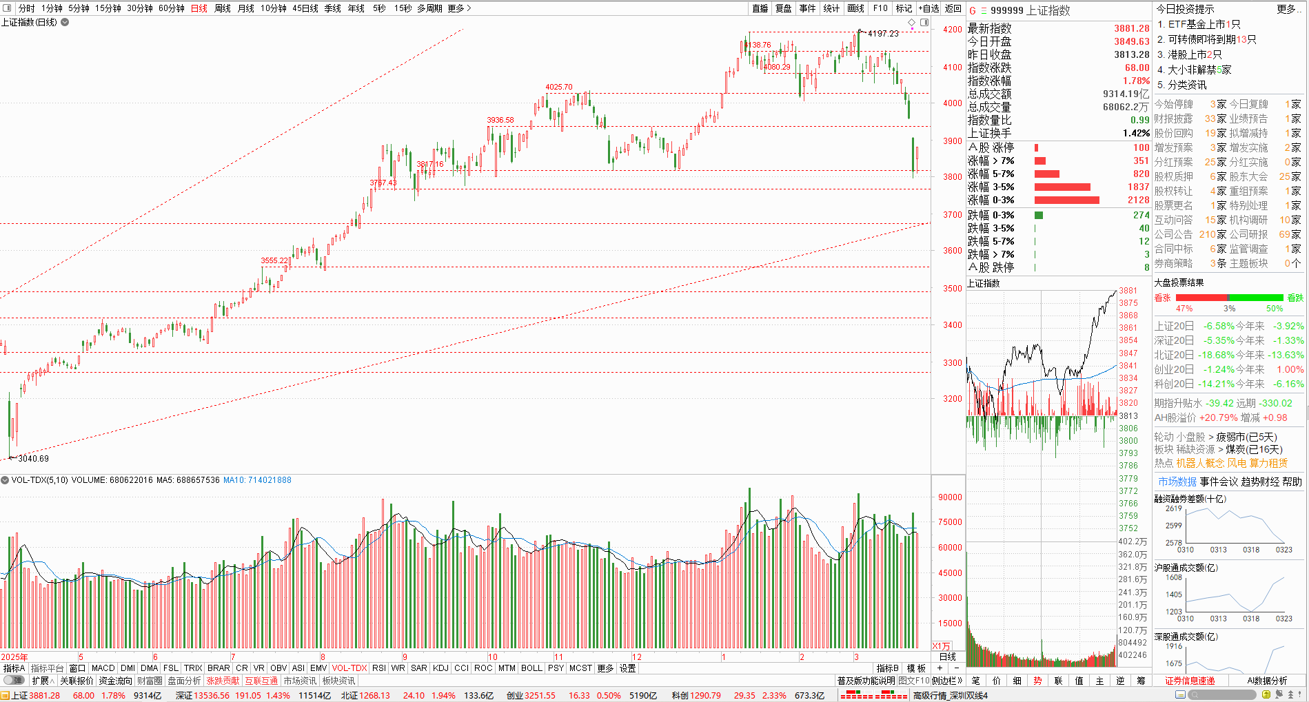受川建国同志停战消息的影响,今天股市高开回踩之后昂头向上,到收盘时候止,上证涨了1.78%,深证涨了1.43%,北证涨了1.94%,创业板涨了0.50%,科创板涨了2.33%。沪深北三市5490只个股,上涨5136只,涨停100只,下跌仅剩329只,跌停8只。总体行情很强。