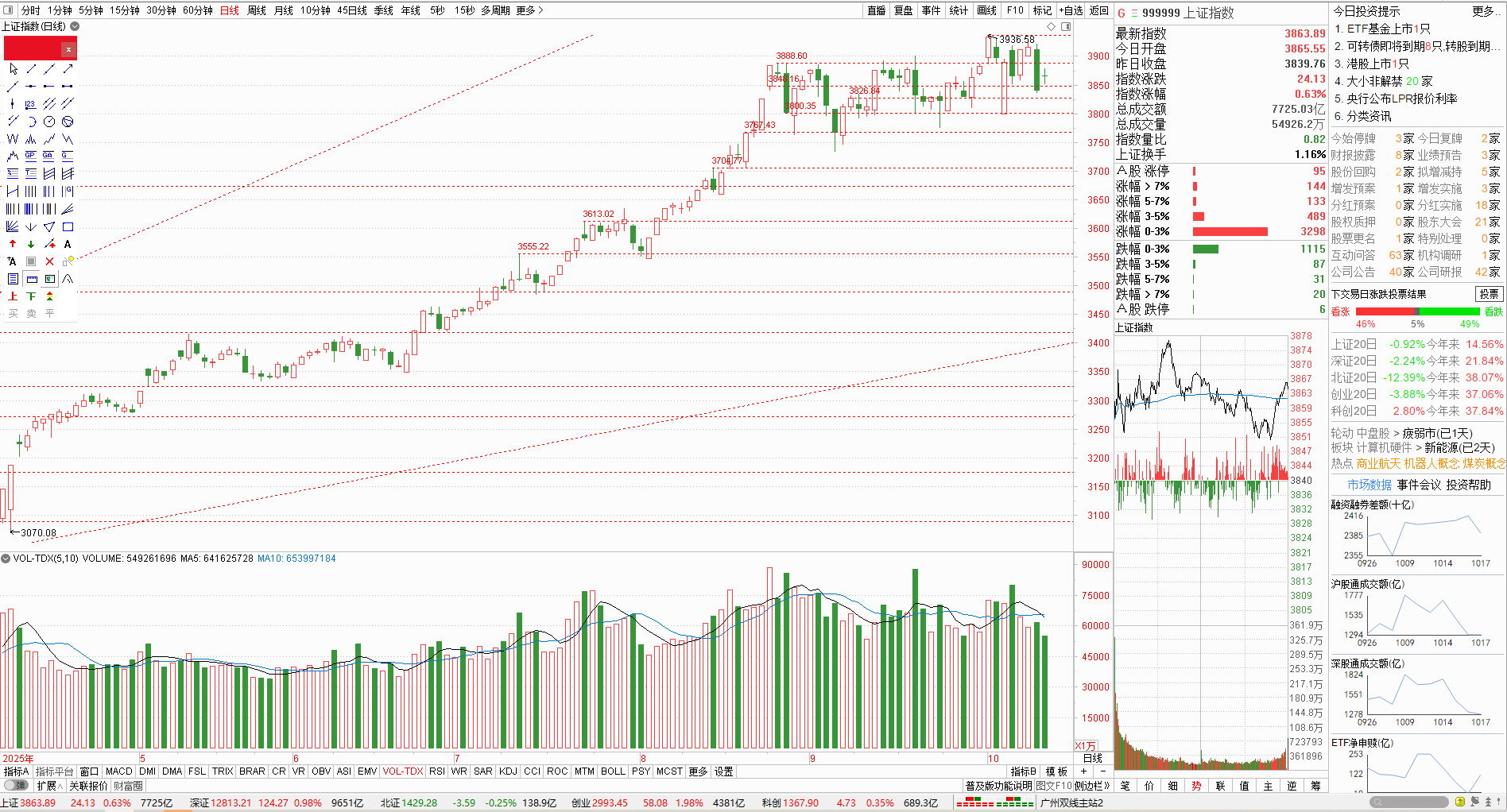 今天大盘在回踩3936之后,出现了止跌向上,促使整个股市都触底回升,到收盘时止,上证涨了0.55%,深证涨了0.19%,北证跌了0.98%,创业板涨了0.29%,科创板跌了1.04%。沪深北三市5445只个股,上涨3535只,涨停90只,下跌1801只,跌停11只。整个风格开始向强。