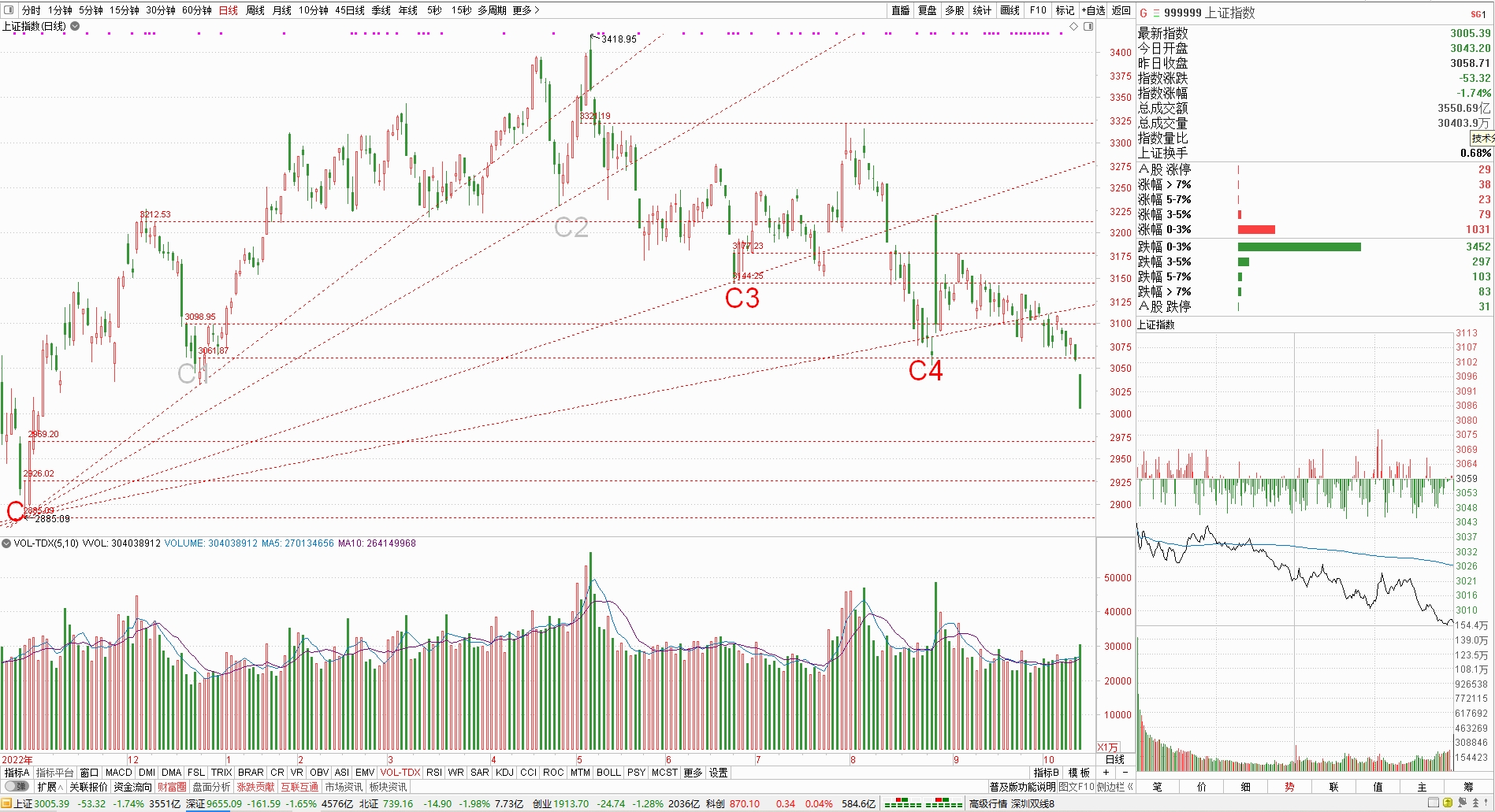 从目前看,指数尚未出现止跌的迹象。就技术而言,最近的支撑是2969,这里要是能够有效守住掉头,短期内就还会向上,但要是守不住,那么大概率会回踩2926或2885区间。时间节点上应该会出现在我之前讲过的10月底或11月上旬。所以实盘上还不可操之过急。