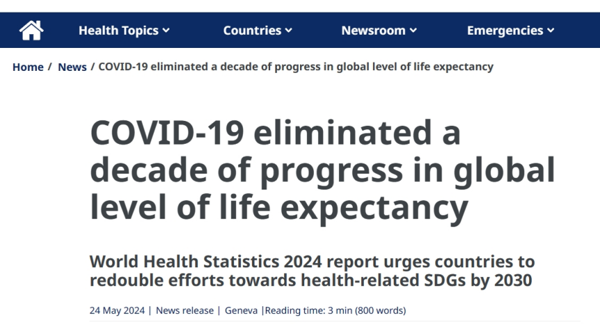 世卫组织总干事谭德塞表示:“我们必须记住,人类在健康和寿命方面取得的进步是多么脆弱。在短短两年内,新冠大流行就摧毁了过去十年的努力和成果。”