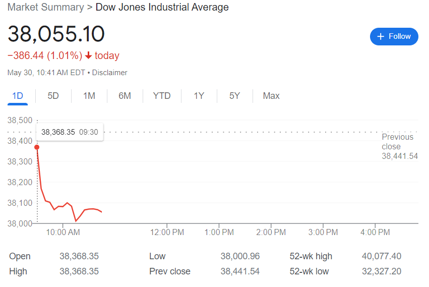 一开始泰勒以为只是个别软件APP出现故障,后来发现整个市场的报价软件都是这个样子,道琼斯指数定格在38055.10点。