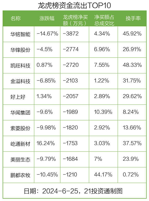 而龙虎榜中资金净流出最多的是华铭智能(300462.SZ),被净卖出为0.39亿元,占总成交金额的4.34%。华铭智能收盘下跌14.67%,换手率为45.92%。