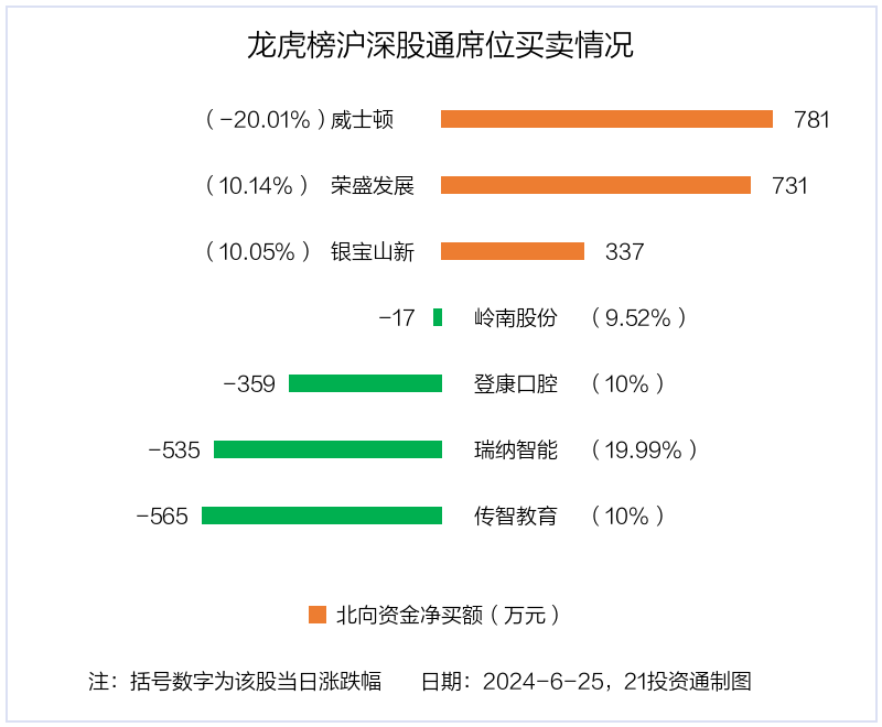 6月25日,北向资金参与龙虎榜中的个股共有7只,合计净买入374.73万元。其中深股通净买入3 股,净卖出4 股,合计净买入374.73万元。