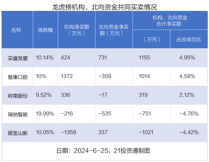 值得注意的是,机构和北向资金共同净买入了荣盛发展;共同净卖出了瑞纳智能;在银宝山新、岭南股份、登康口腔上出现分歧,机构净卖出银宝山新1357.53万元,北向资金净买入336.71万元;机构净买入岭南股份335.52万元,北向资金净卖出16.65万元;机构净买入登康口腔1372.15万元,北向资金净卖出358.63万元。