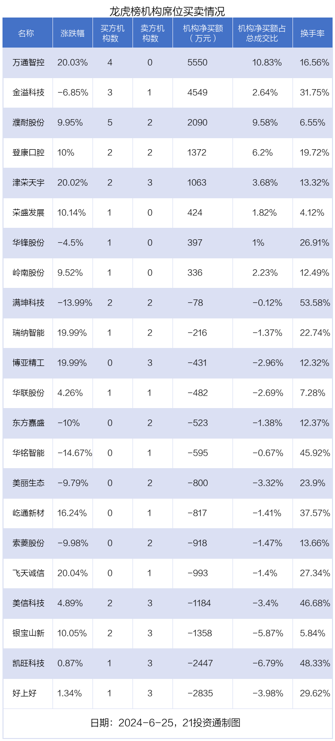 其中,机构净买入金额最多的是万通智控(300643.SZ),当日收盘上涨20.03%,换手率为16.56%。