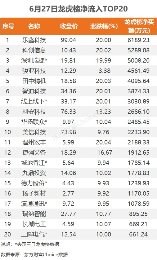 日内上榜龙虎榜个股中,资金净流入最多的是乐鑫科技,为6189.23万元。数据显示,该股日内20CM涨停,全天换手率8.65%,成交额9.47亿元。资金净流入居前的陆股通席位日内净买入1369.7万元。