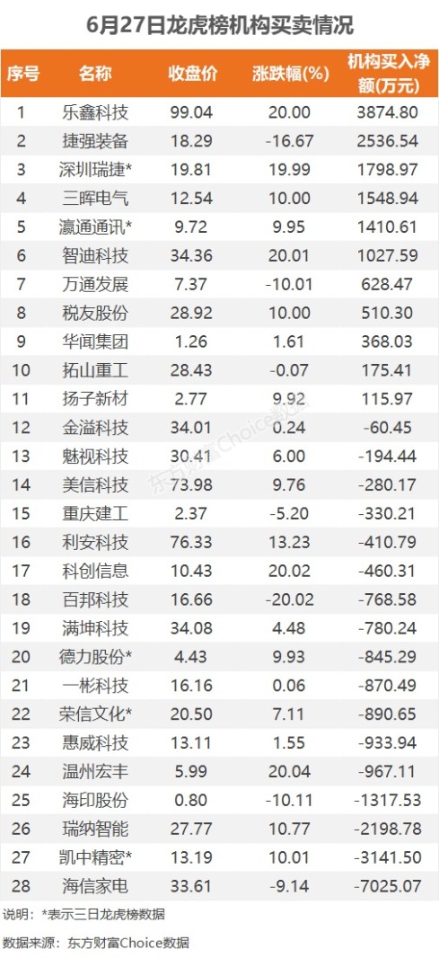 机构参与龙虎榜中个股共涉及28股,其中11股被机构净买入,乐鑫科技被买入最多,为3874.8万元。另外17股被机构净卖出,海信家电被卖出最多,为7025.07万元。