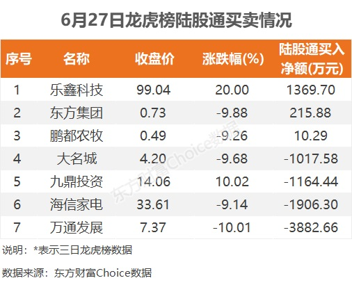 陆股通参与龙虎榜中个股共涉及7股,其中3股被陆股通净买入,乐鑫科技被买入最多,为1369.7万元。另外4股被陆股通净卖出,万通发展被卖出最多,为3882.66万元。