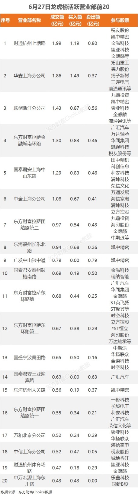 从活跃营业部来看,财通杭州上塘路成交1.99亿元,参与了税友股份、凯中精密、金溢科技、骏亚科技、金麒麟等股票。华鑫上海分公司成交1.86亿元,参与了拓山重工、德力股份、扬子新材、三晖电气、瀛通通讯等股票。中金上海分公司成交1.08亿元,参与了万通发展、海信家电和满坤科技。