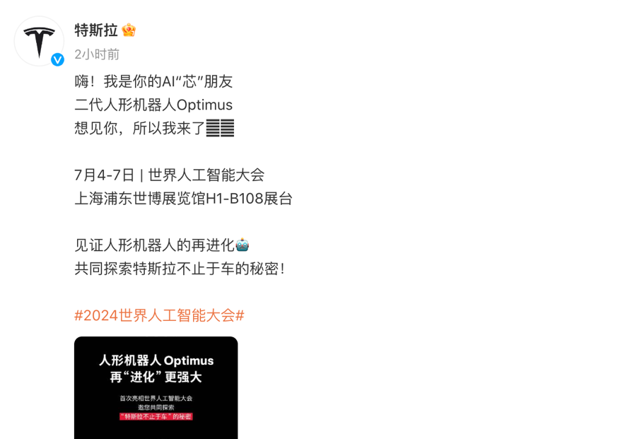 北京时间7月3日晚,特斯拉官方微博宣布,二代人形机器人Optimus将在7月4日至7日于上海举行的2024世界人工智能大会首次亮相,“见证人形机器人的再进化”。