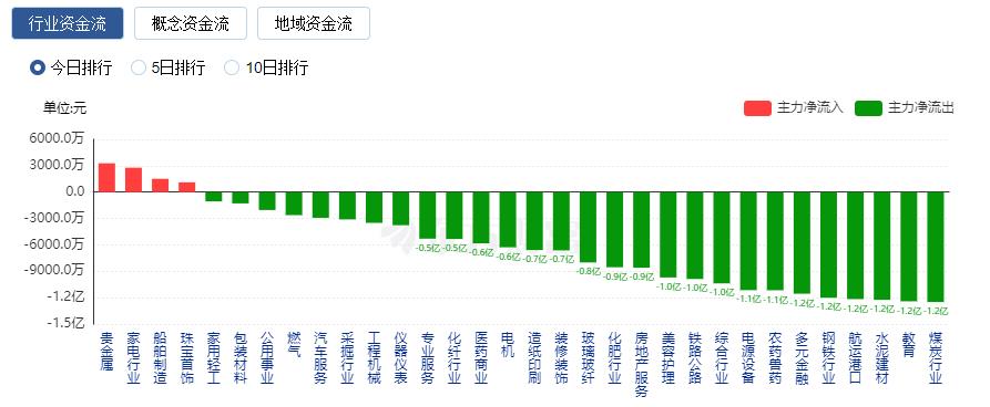 行业资金方面,截至收盘,贵金属、家电行业、船舶制造等净流入排名靠前,其中贵金属净流入3278万。