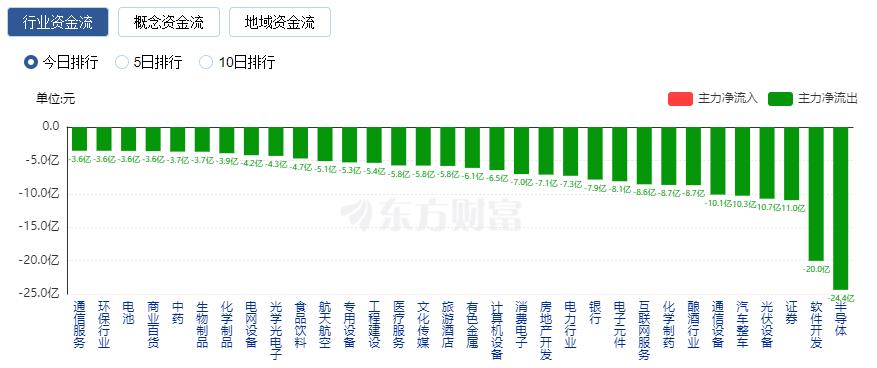 净流出方面,半导体、软件开发、证券等净流出排名靠前,其中半导体净流出24.38亿元。
