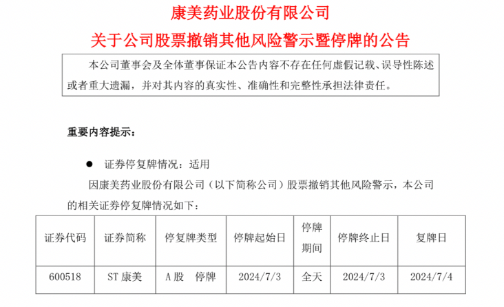 7月2日晚,康美药业公告,公司股票2024年7月4日起撤销其他风险警示。ST 康美股票将于 2024年7月3日停牌 1天,2024 年 7月4日开市起复牌并撤销其他风险警示。