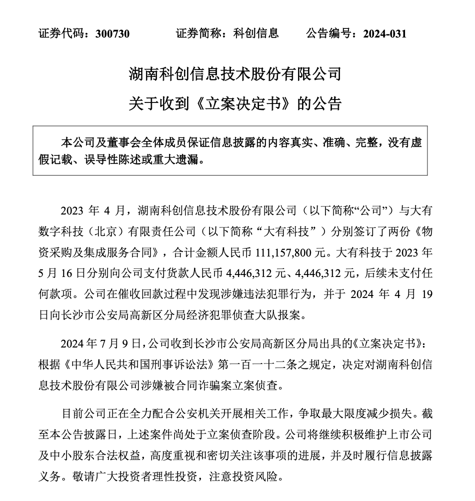 2024年7月9日,公司收到长沙市公安局高新区分局出具的《立案决定书》,根据《中华人民共和国刑事诉讼法》第一百一十二条之规定,决定对湖南科创信息技术股份有限公司涉嫌被合同诈骗案立案侦查。