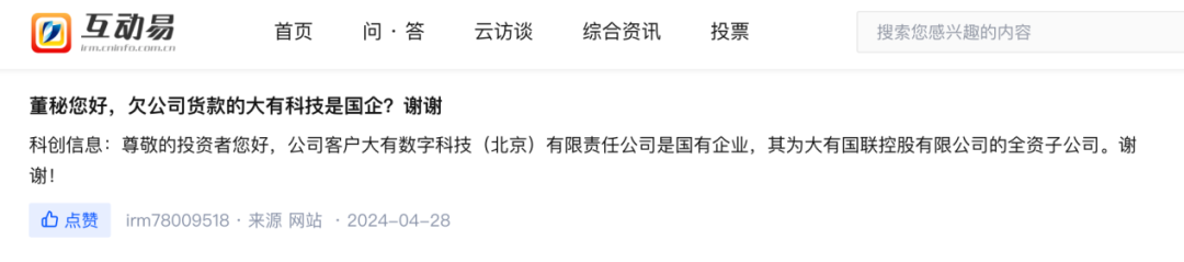 科创信息也曾在互动易平台表示,公司客户大有科技是国有企业,其为大有国联控股有限公司的全资子公司。