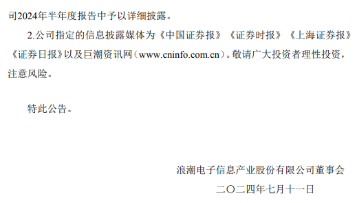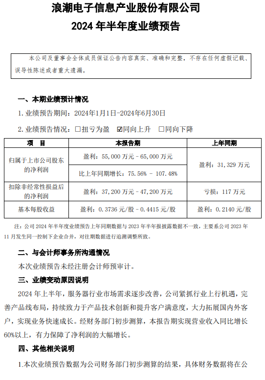浪潮信息公告,预计2024年半年度归属于上市公司股东的净利润为5.5亿元–6.5亿元,同比增长75.56%-107.48%。2024年上半年,服务器行业市场需求逐步改善,公司紧抓行业上行机遇,完善产品线布局,持续致力于产品技术创新和提升客户满意度,大力拓展国内外客户,实现业务快速成长。经财务部门初步测算,本报告期实现营业收入同比增长60%以上,有力保障了净利润的大幅增长。