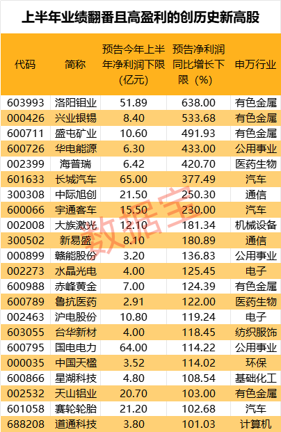 从预告净利润增速下限来看,在去年上半年盈利超亿元的创历史新高股中,有22股预计2024年上半年净利润同比增幅超100%。