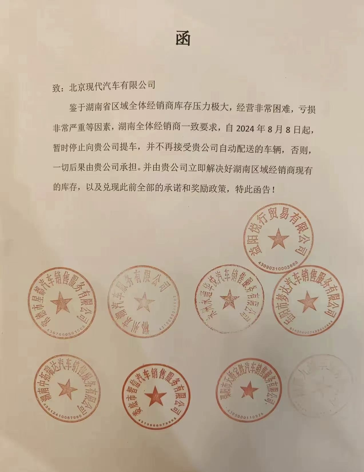 8月8日,一份网传的湖南省经销商致北京现代的函流传于网络,该信函称,鉴于湖南省区域全体经销商库存压力极大,经营非常困难,亏损非常严重等因素,湖南全体经销商一致要求,自2024年8月8日起暂时停止向贵公司提车,并不再接受贵公司自动配送的车辆,否则,一切后果由贵公司承担。并由贵公司立即解决好湖南区域经销商现有的库存,以及兑现此前全部的承诺和奖励政策。信函底部有9家汽车经销商的盖章。