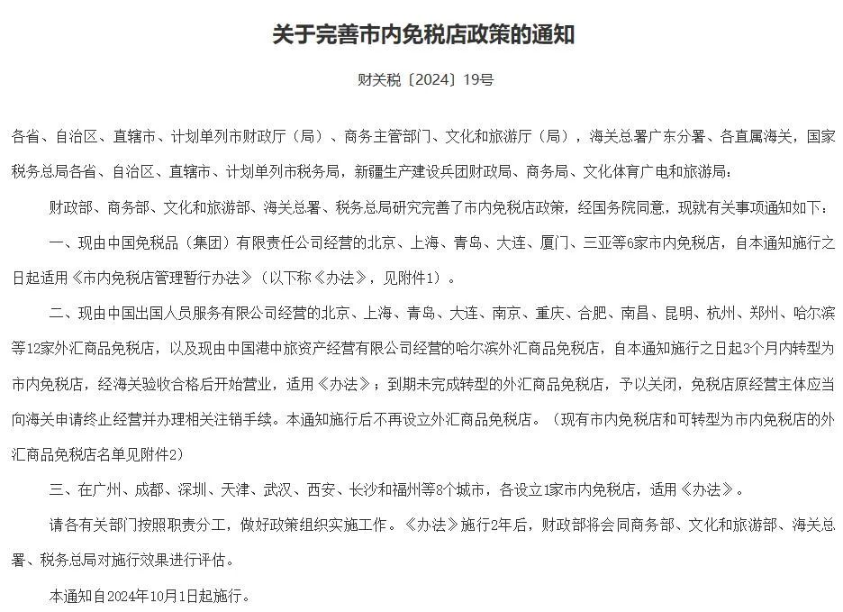 近日,财政部、商务部、文化和旅游部、海关总署、税务总局印发《关于完善市内免税店政策的通知》(下称《通知》),明确自2024年10月1日起,按照《市内免税店管理暂行办法》(下称《办法》)规范市内免税店管理工作,促进市内免税店健康有序发展。
