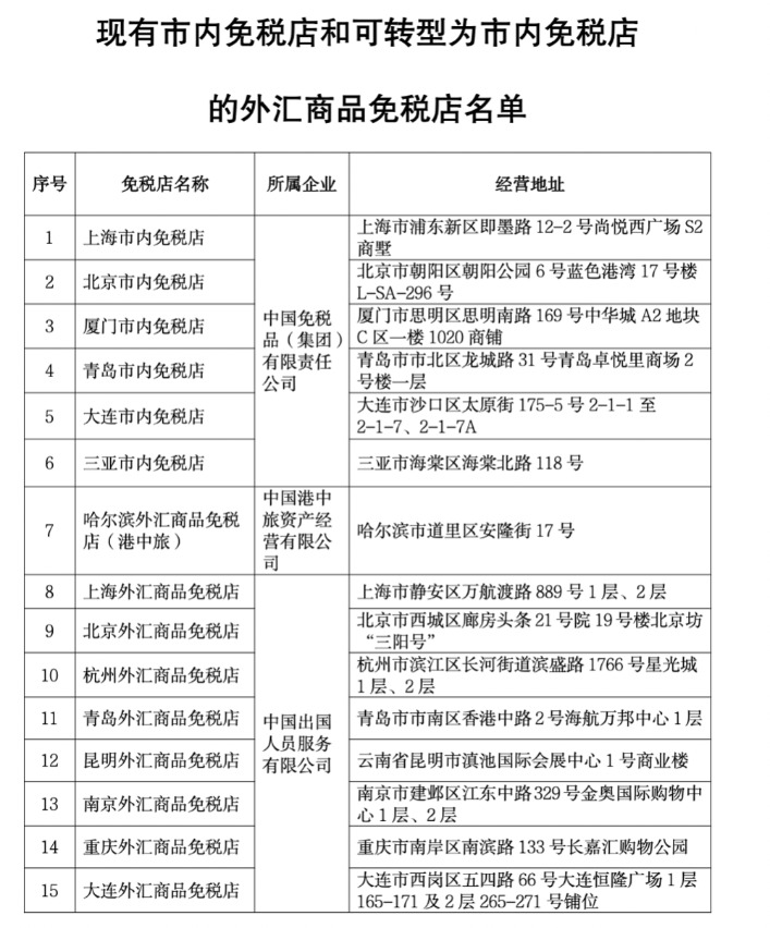 根据《通知》,现有北京、上海、青岛、大连、厦门、三亚等6家市内免税店,自《通知》施行之日起适用《办法》;现有北京、上海、哈尔滨等13家外汇商品免税店,自《通知》施行之日起3个月内转型为市内免税店,经海关验收合格后开始营业。同时,在广州、成都、深圳、天津、武汉、西安、长沙和福州等8个城市,各设立1家市内免税店。
