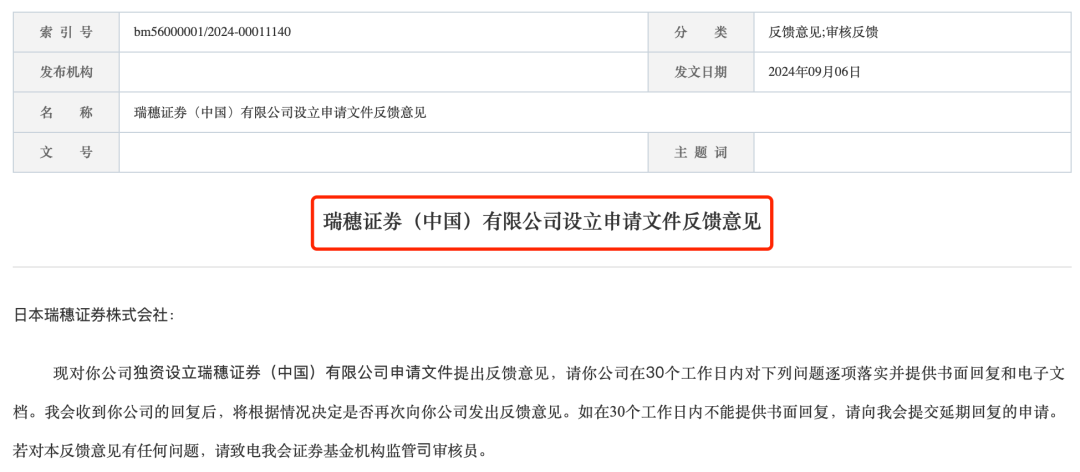 9月6日晚间,证监会网站发布了《瑞穗证券(中国)有限公司设立申请文件反馈意见》。证监会对日本瑞穗证券株式会社(以下简称日本瑞穗证券)独资设立瑞穗证券(中国)的申请文件提出三点反馈意见。