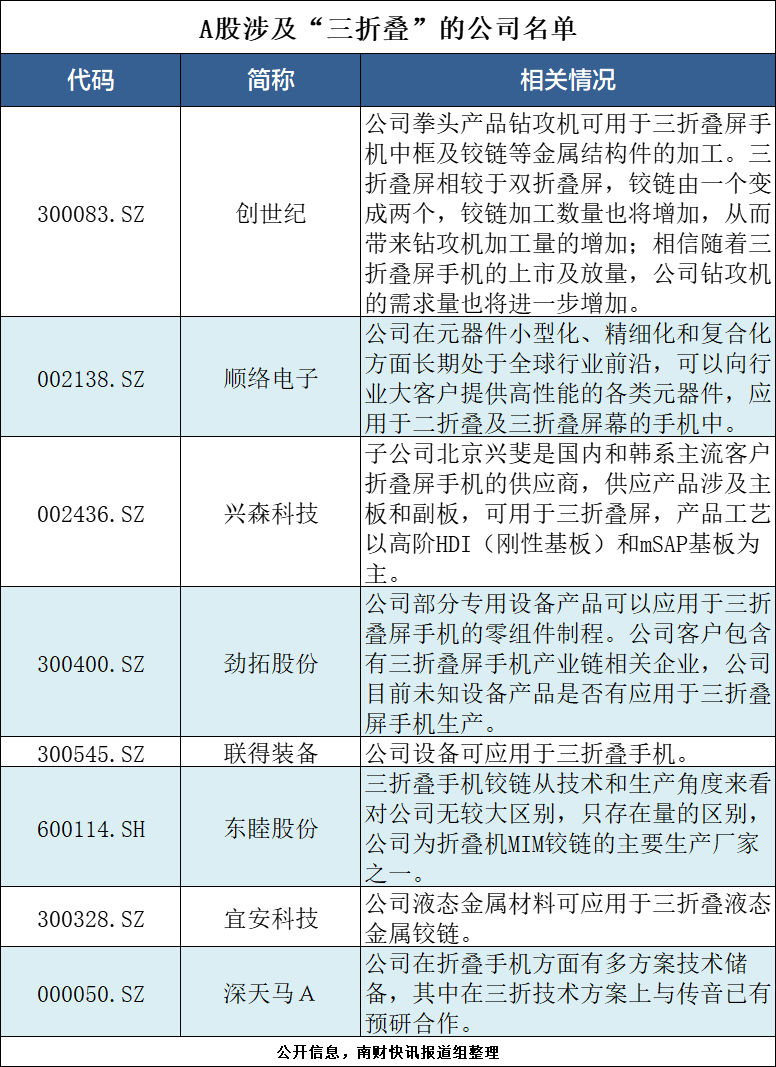 此外,据记者不完全统计,创世纪、劲拓股份、深天马A等多家公司曾披露“三折叠”的相关情况。具体如下: