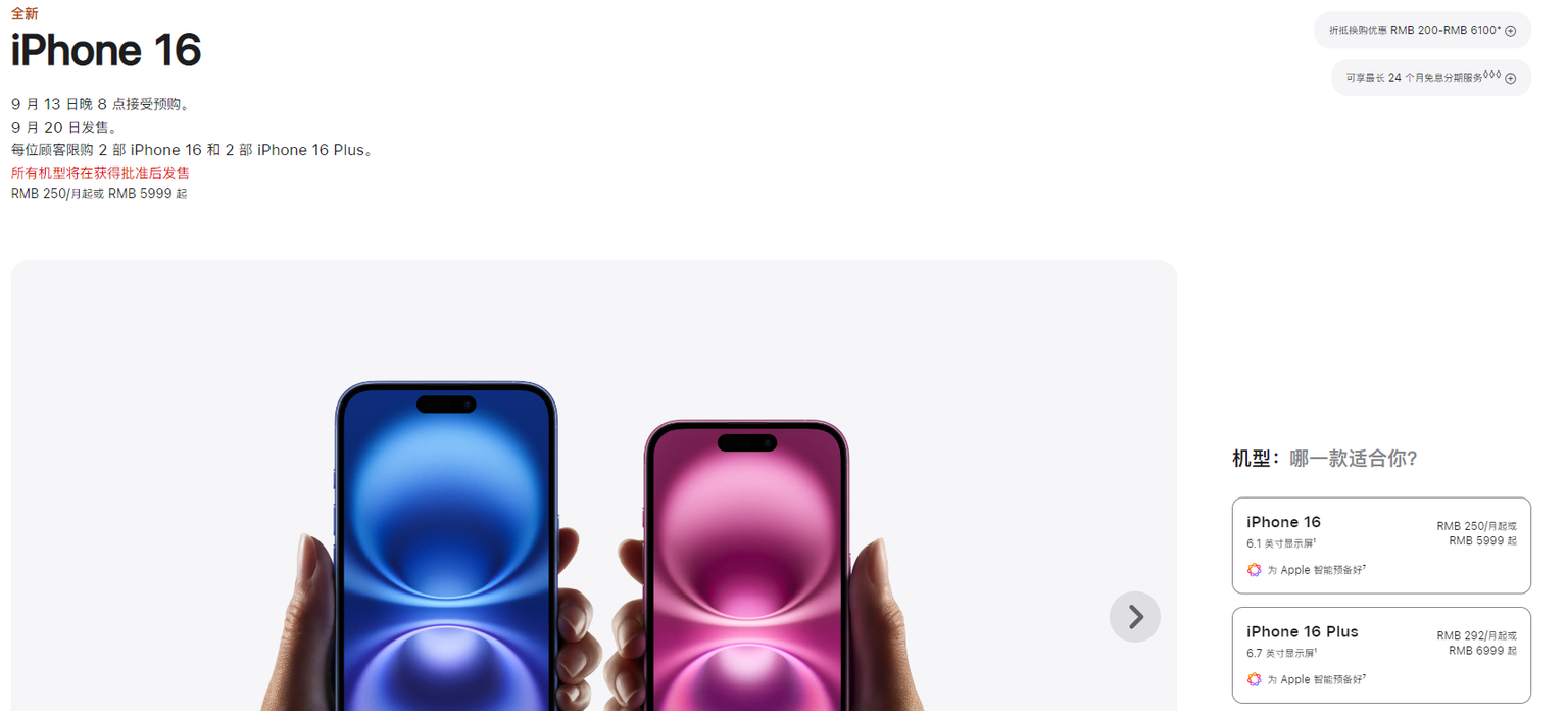 根据苹果中国官网信息,四款新手机的定价与iPhone 15系列完全一致,从5999元至最高13999元。同样是本周五开始预订,下周五发货。