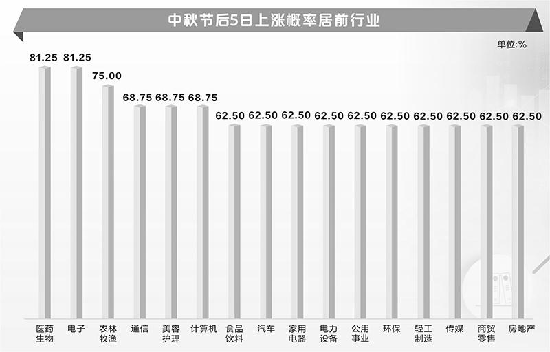 据数据宝统计,2008年以来,中秋节后5个交易日内,上涨次数最多的行业是医药生物、电子,两者均有13次上涨,上涨概率为81.25%。农林牧渔行业上涨概率为75%,居次席;紧随其后的是通信、美容护理、计算机行业。
