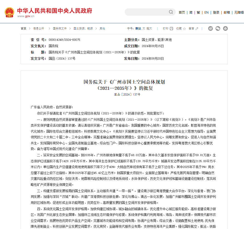 据中国政府网9月20日消息,作为全国市级国土空间规划唯一试点,《广州市国土空间总体规划(2021-2035年)》已于近日获国务院批复。