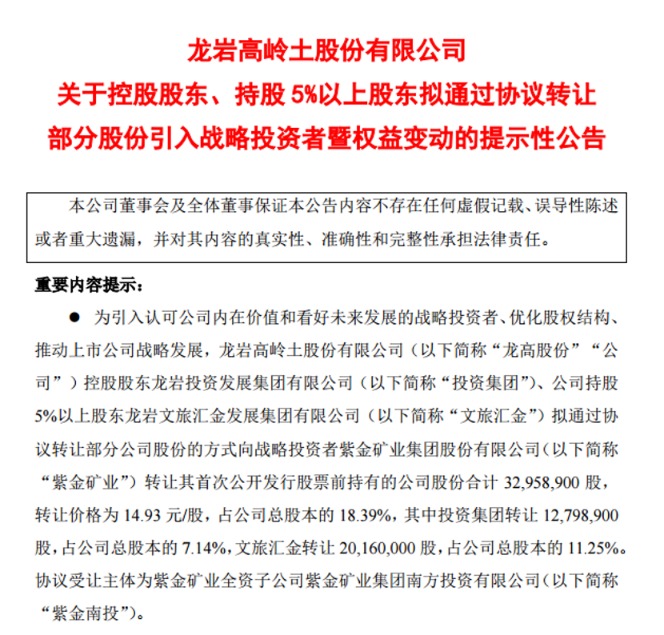 9月22日晚,龙高股份公告,公司前三大股东龙岩投资集团、龙岩文旅汇金、兴杭国投与紫金矿业子公司紫金南投四方共同签署了《关于龙岩高岭土股份有限公司的股份转让协议》,后者拟合计受让龙高股份20%的股份。