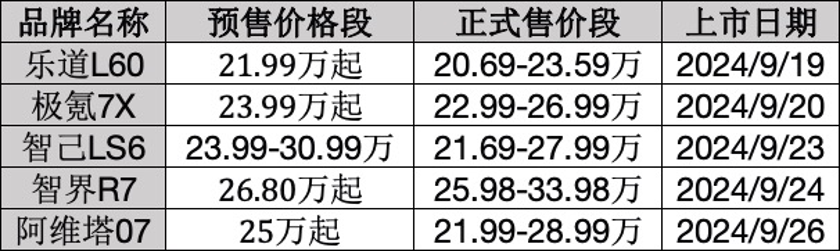 据《科创板日报》记者不完全统计,9月各个新能源品牌的新车型共计14款,其中纯电SUV车型更是多达9款,并且6款车价位段处于20-30万价格区间。包括乐道L60,极氪7X和智界R7等车型甚至在发布会上直接喊出了“对标Model Y”的口号。