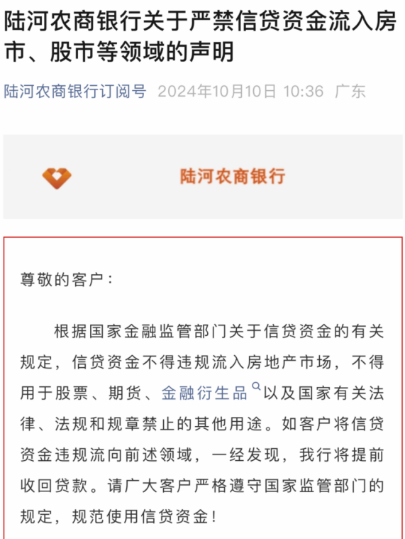 陆河农商银行发布关于严禁信贷资金流入房市、股市等领域的声明。在文中,陆河农商银行表示,根据国家金融监管部门关于信贷资金的有关规定,消费类贷款资金不得违规流入房地产市场,不得用于股票、期货、金融衍生品投资,以及国家有关法律、法规和规章禁止的其他用途。如客户将信贷资金违规流向前述领域,一经发现,该行将提前收回贷款。