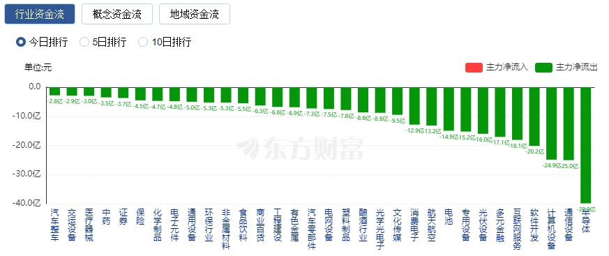 净流出方面,半导体、通信设备、计算机设备等净流出排名靠前,其中半导体净流出39.87亿元。