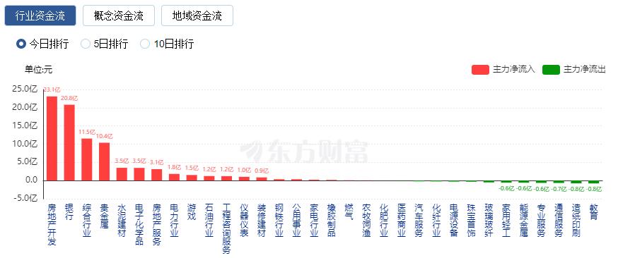 行业资金方面,截至收盘,房地产开发、银行、综合行业等净流入排名靠前,其中房地产开发净流入23.11亿。