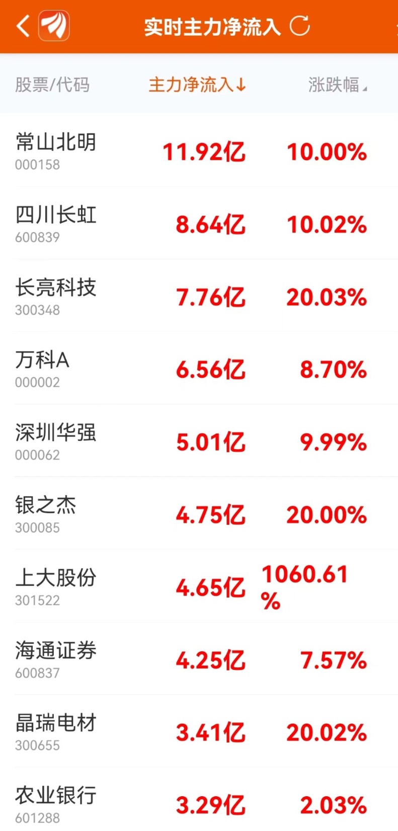 东方财富Choice数据显示,10月16日主力净买入前10大个股中,常山北明排名第一,主力净买入11.92亿元,该股今日涨停;四川长虹排名第二,主力净买入8.64亿元。