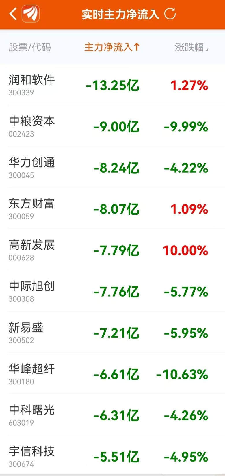 东方财富Choice数据显示,10月16日主力净卖出前10大个股中,润和软件排名第一,主力净卖出13.25亿元;中粮资本排名第二,主力净卖出9亿元。