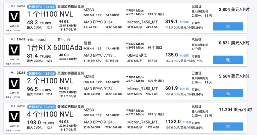 在算力租赁市场,价格下降的幅度更加明显。据了解,H100芯片最初的租赁价格为4.7美元/小时,在需求巅峰时期一度被爆炒至每小时8美元以上。记者查询算力租赁网站发现,如今1个H100NVL的租赁价格在每小时2—3美元之间,价格比巅峰时期已跌超50%。