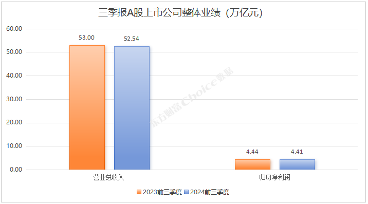 总体来看,2024年前三季度5356家A股上市公司合计实现营业总收入52.54万亿元,同比下降0.87%;合计实现归母净利润4.41万亿元,同比下降0.53%。