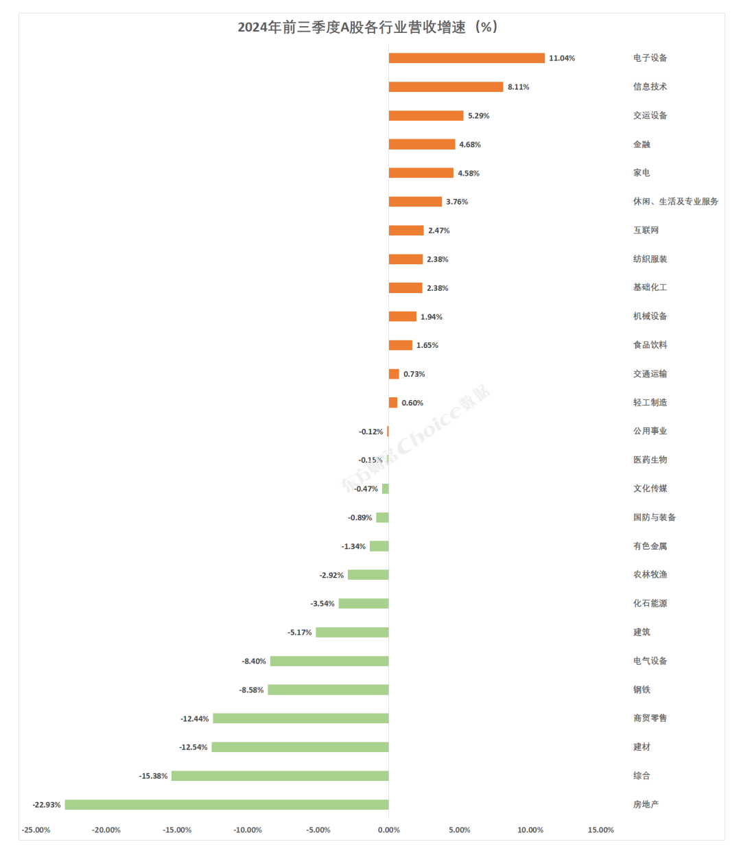 行业营收增速方面,27个东财一级行业中,电子设备营收增速最快,达到11.04%;信息技术、交运设备行业排名第二、第三,营收增速分别为8.11%、5.29%。房地产、综合、建材、商贸零售行业营收增速均低于-10%。