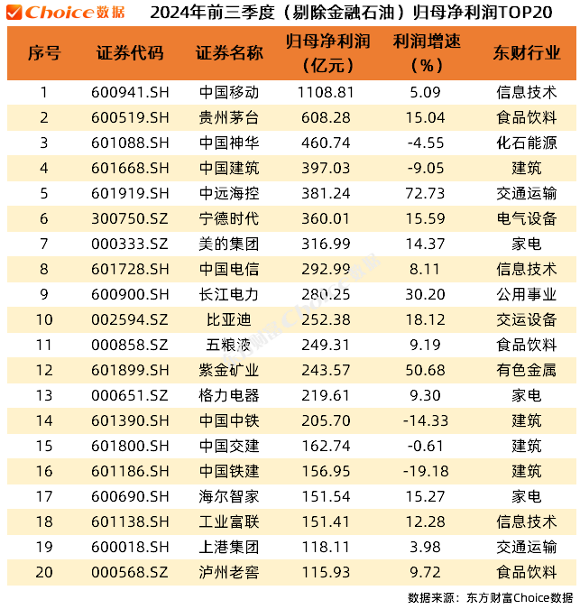 剔除金融石油,中国移动、贵州茅台、中国神华位列归母净利润前三位。