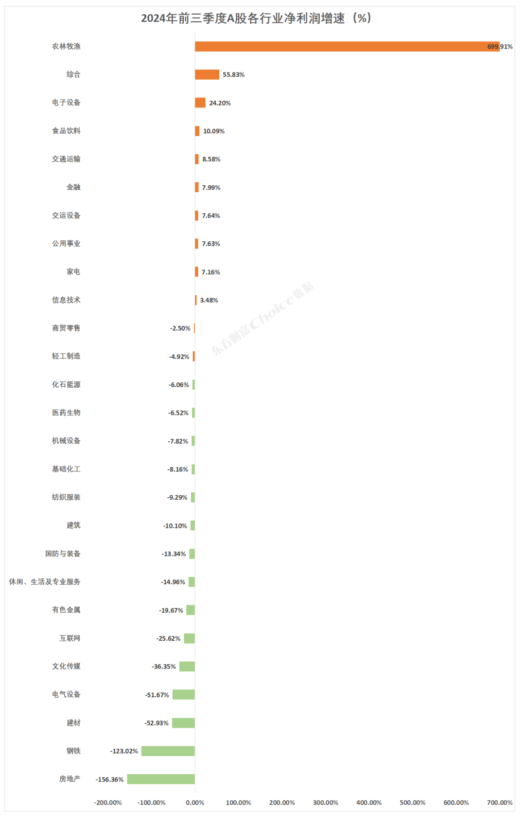 净利润增速方面,农林牧渔行业净利润增速最快,达699.91%,综合、电子设备行业分别增长55.83%、24.20%。房地产、钢铁行业净利润增速同比下降超100%。