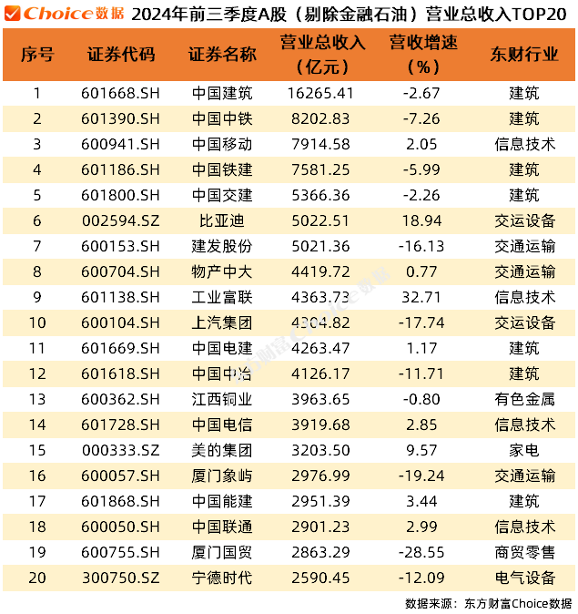 剔除金融石油,中国建筑、中国中铁、中国移动位列营业总收入前三位。