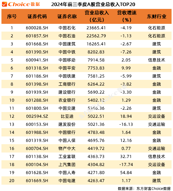 2024年前三季度,中国石化以营业总收入23665.41亿元位列第一,中国石油、中国建筑营业总收入均在万亿元以上。