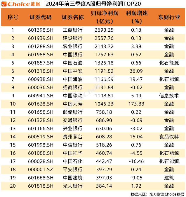 归母净利润方面,工商银行以2690.25亿元位居A股2024年前三季度利润榜首位;建设银行、农业银行、中国银行归母净利润均超过1500亿元。