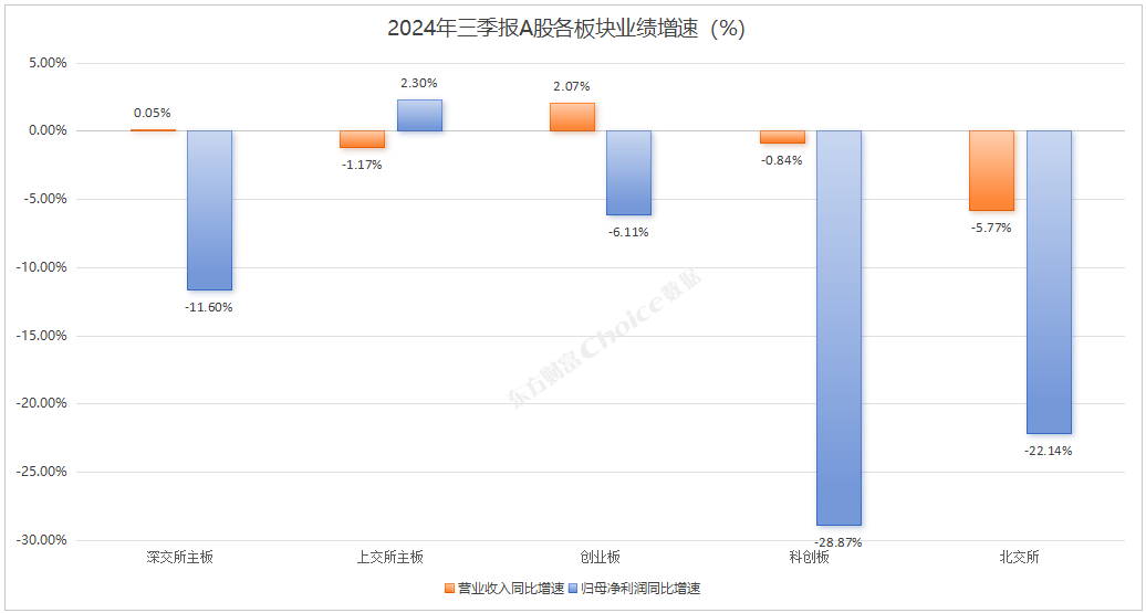 分板块来看,深交所主板、创业板实现营业收入同比增长;上交所主板实现归母净利润同比增长。