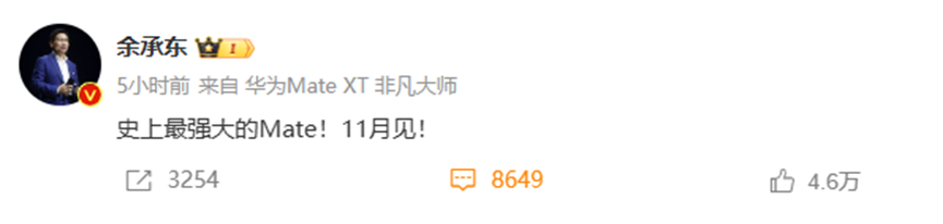 消息面上,今日早间,华为常务董事、终端BG董事长余承东在个人微博上表示:“史上最强大的Mate!11月见!”