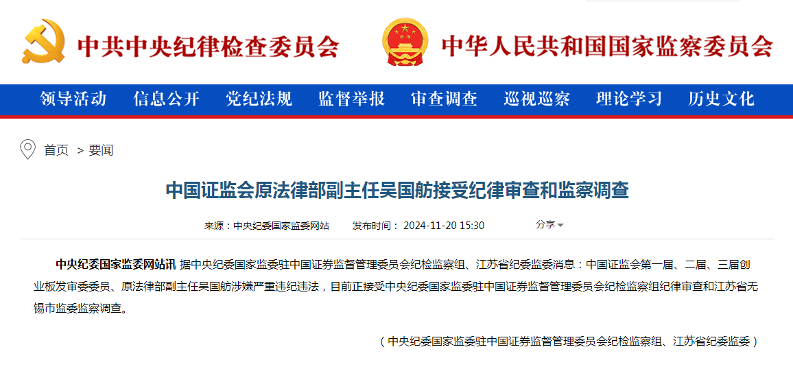 据中央纪委国家监委驻中国证券监督管理委员会纪检监察组、江苏省纪委监委消息:中国证监会第一届、二届、三届创业板发审委委员、原法律部副主任吴国舫涉嫌严重违纪违法,目前正接受中央纪委国家监委驻中国证券监督管理委员会纪检监察组纪律审查和江苏省无锡市监委监察调查。